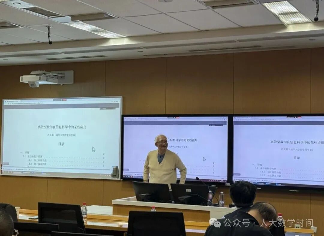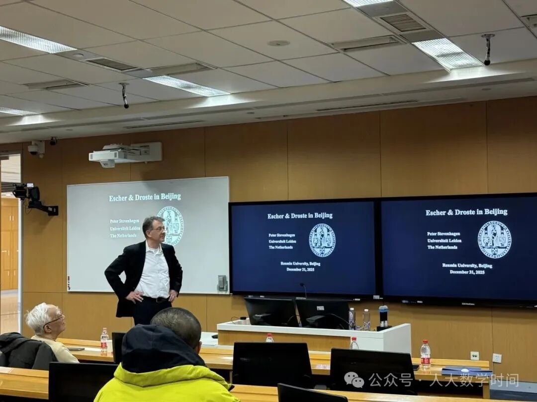 2025年12月31日14:00,在中国人民大学立德楼603教室,第三十九期“人大数学时间”活动成功举行。本期活动聚焦数学与信息科学前沿问题,特别邀请了荷兰莱顿大学的Peter Stevenhagen教授和清华大学的冯克勤教授,分别以《Escher and Droste in Beijing》和《离散型数学在信息科学中的某些应用》为主题,开展报告及前沿问题研讨,吸引了线上线下众多数学爱好者与专业人士参与。活动由王善文副院长主持,现场学术氛围浓厚。