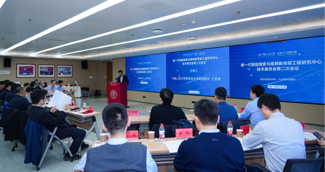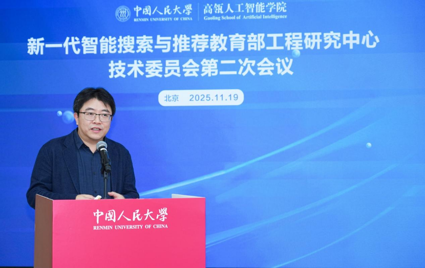 2025年11月19日,新一代智能搜索与推荐教育部工程研究中心(以下简称“中心”)技术委员会第二次会议在中国人民大学立德楼1826多功能厅召开。中国人民大学副校长王小虎出席会议并致辞。会议由中心技术委员会主任、中国科学院院士胡事民,中心技术委员会副主任、学校明理书院院长杜小勇和学校科学技术发展部部长王亚培共同主持,中心主任、高瓴人工智能学院执行院长文继荣,以及来自国内知名院校和科研机构的40余位专家学者参加会议。