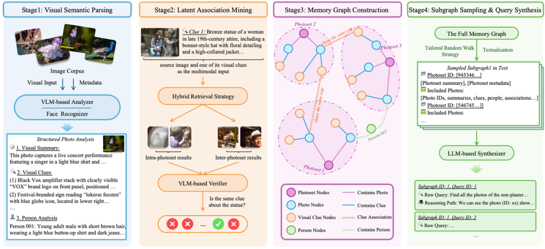 特点一:人机协同的隐性关联挖掘。 从数千张跨度数年的照片中发掘隐藏的关联(如“这座雕像在半年内的两次不同旅行中都被拍到了”)成本极高。为此,团队设计了一套自动化流水线:先由 VLM 解析视觉线索,再通过图谱构建自动挖掘不同事件间的隐藏关联,最后由人类专家进行严格的核验与质量把关,确保了数据构建的高效与高质量。