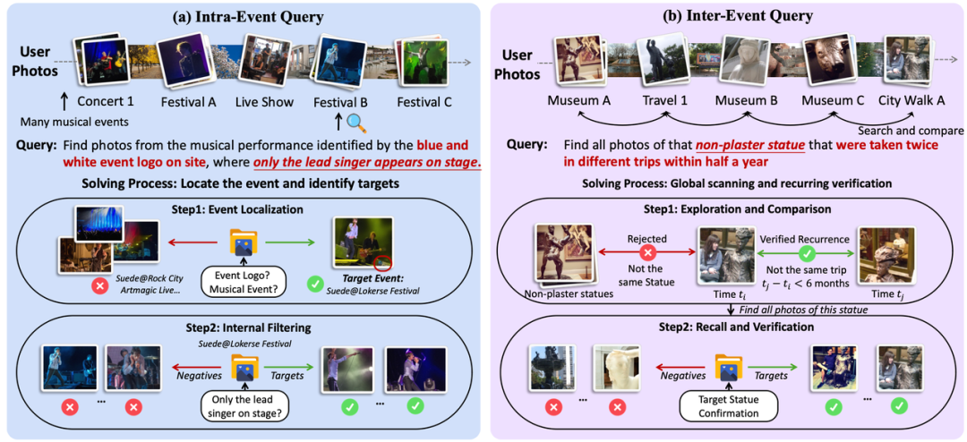 面对“找到烟花秀结束后几天前往海边拍摄的照片”这类依赖上下文关联的复杂查询,传统方法难以串联分散的视觉线索,无法完成长程、多步的深度检索任务。