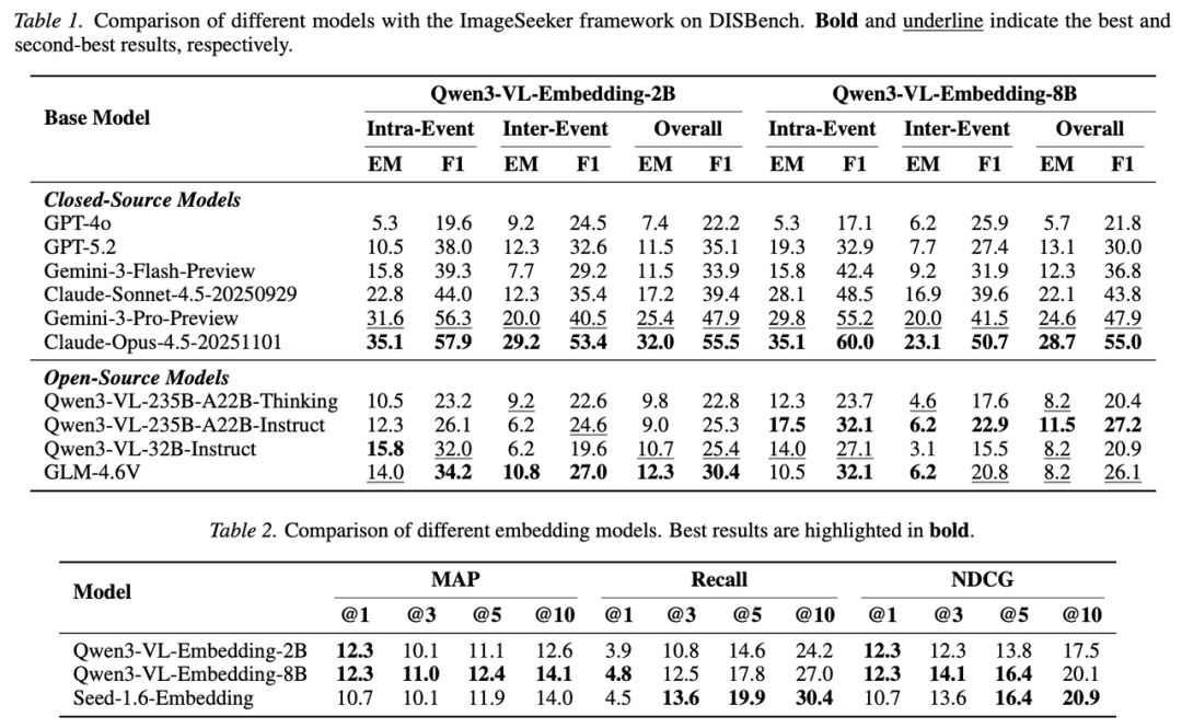 基于ImageSeeker框架,团队在DISBench上对当前主流的前沿多模态大模型(包括 GPT-5.2、Claude-Opus-4.5、Gemini-3-Pro 以及 Qwen3-VL、GLM-4.6V 等)进行了系统评测,得出了以下关键发现: