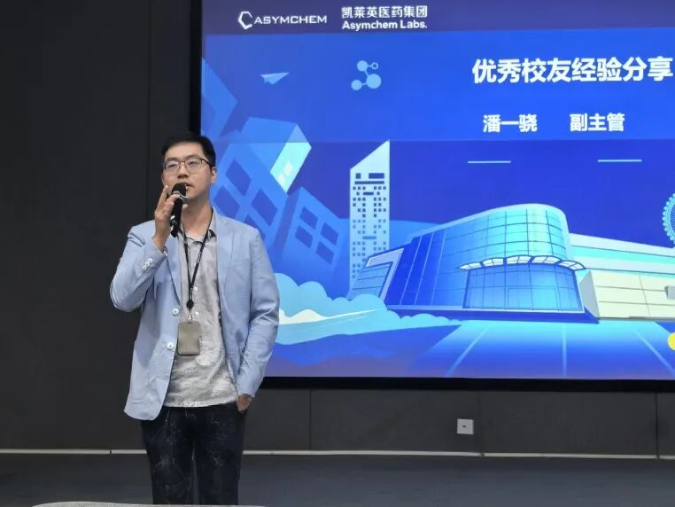 在随后的校友分享环节中,毕业于中国人民大学的潘一骁副主管以亲身经历,娓娓道来从校园到企业的成长轨迹。他以自己在凯莱英五年的发展历程为例,分享了从初级研究员到团队负责人的职业跃迁,为学弟学妹们提供了宝贵的职业参考。