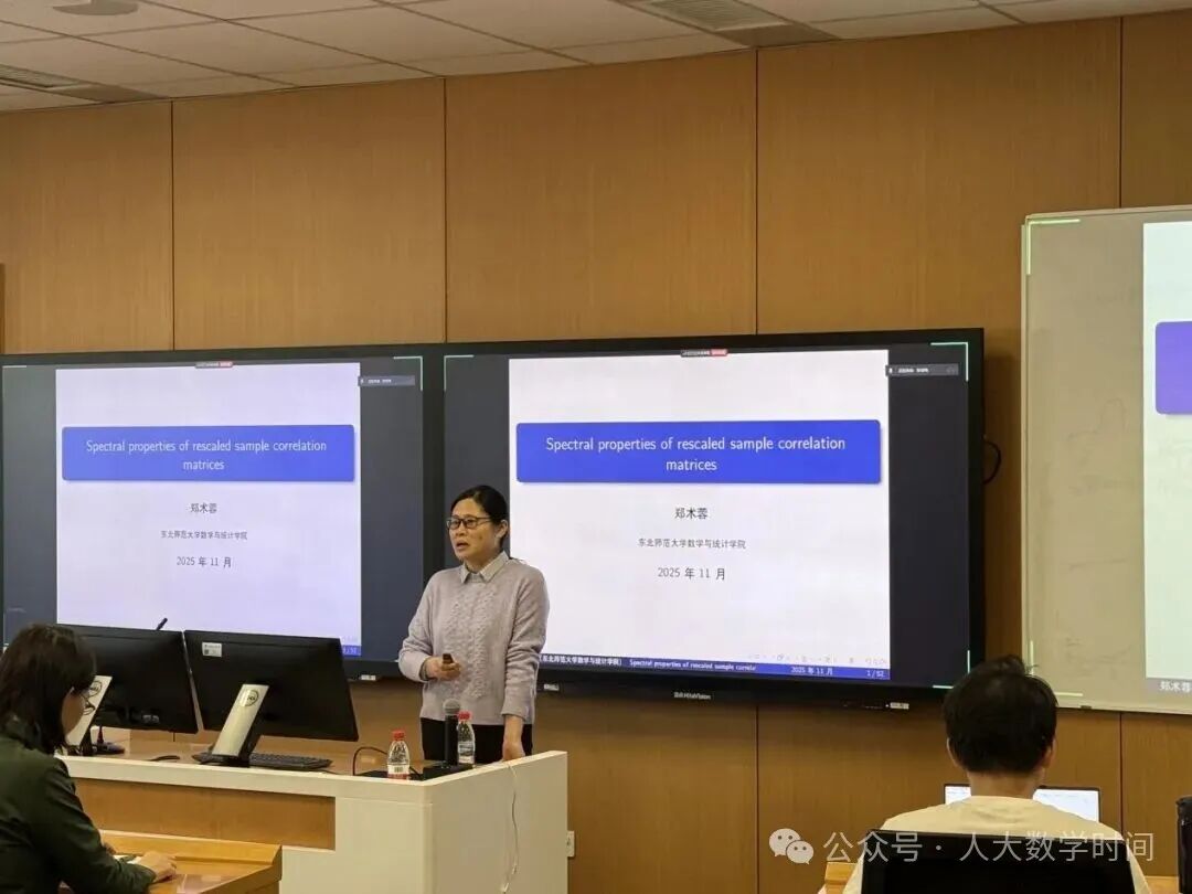 2025年11月28日15:00,在中国人民大学立德楼503教室,第三十六期“人大数学时间”活动成功举行。本期活动聚焦数据科学前沿问题,特别邀请了东北师范大学郑术蓉教授,以《Spectral Properties of High-dimensional Rescaled Sample Correlation Matrices》为主题,开展报告及前沿问题研讨,吸引了众多数学爱好者与专业人士参与。活动由统计学院许王莉教授主持,现场学术氛围浓厚。