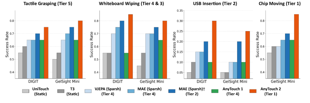 我们设计了4个不同难度、属于金字塔不同层级的真实世界操纵任务来全面地评估各触觉模型是否拥有支持不同操纵任务的感知能力:触觉抓取(Tier 5)、擦白板(Tier 4 & 3)、USB插入(Tier 2)和薯片移动(Tier 1)。