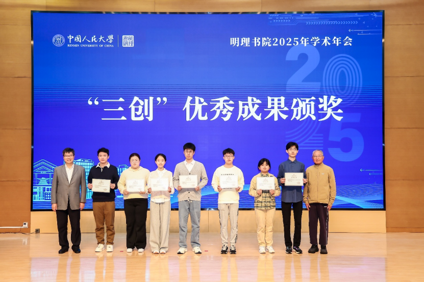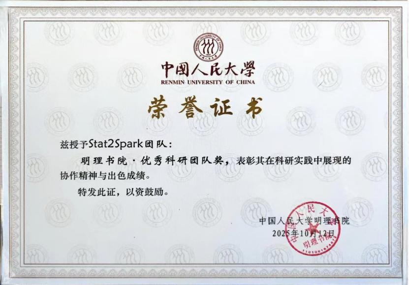 在明理书院2025年学术年会上,林尚立校长为Stat2Spark团队颁发“明理书院优秀科研团队奖”,中国人民大学统计与大数据研究院2022级博士生黄君烈作为Stat2Spark团队代表领奖,并在学术年会明理创新实验室分论坛分享团队建设经验和创新成果。