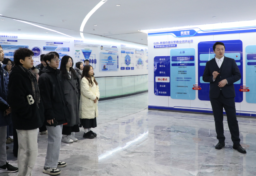 1月12日,实践团前往国家大数据(贵州)综合试验区展示中心进行参观学习。作为展示贵州大数据发展成果的“窗口”,这里记录了贵州从零起步到成为中国大数据发展高地的非凡历程。实践团成员们通过实地探访,深入了解了贵州在数据制度创新、产业融合应用及算力基础设施建设等方面的顶层设计与实践成果。