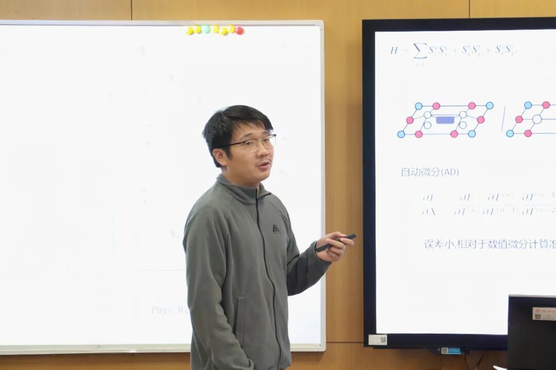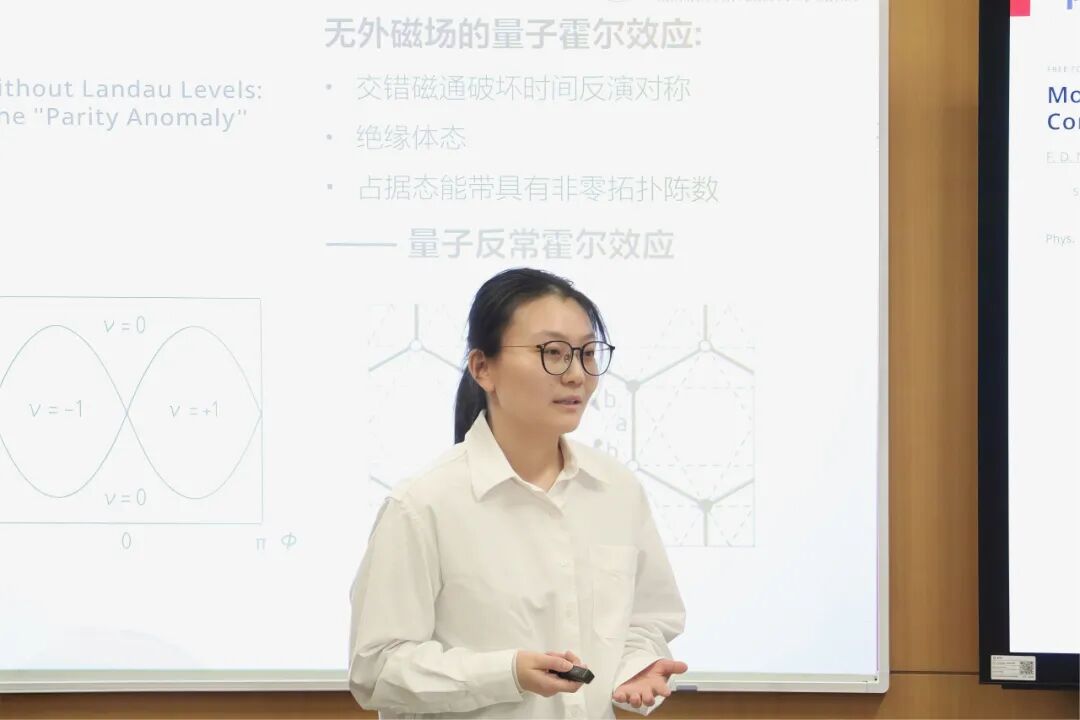 2024级物理学院博士生王耀扬演讲题目是《电子的“停滞”——平带的特性与实现》 ,他生动的给大家介绍了平带的三个物理路径,并且介绍了平带结构中强关联效应所催生出的超导、莫特绝缘、分数量子霍尔效应等特殊现象。