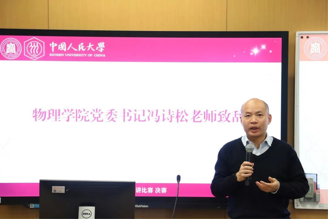 物理学院党委书记冯诗松致开场辞。冯诗松首先对各位评委和同学的到来表示感谢。他指出,学术演讲比赛立足于学院学科特色,是推动学生学术科研守正创新、促进学科交叉融合的重要学生学术品牌活动。他鼓励同学们通过这一平台触摸不同领域科学研究的前沿,在相互交流中促进成长,同时进一步锻炼和提升学术表达与呈现展演能力,真正做到不仅科研做得出彩,也能讲得明白透彻。