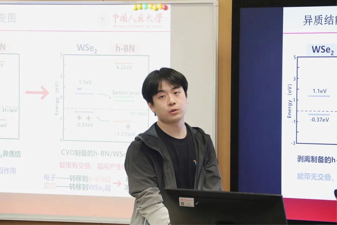 2025级物理学院博士生李开的演讲题目是《利用缺陷h-BN调控WSe2光致发光》,他介绍用CVD合成h-BN/WSe₂异质结,利用异质结缺陷能级使得WSe₂的光致发光发生强烈猝灭。