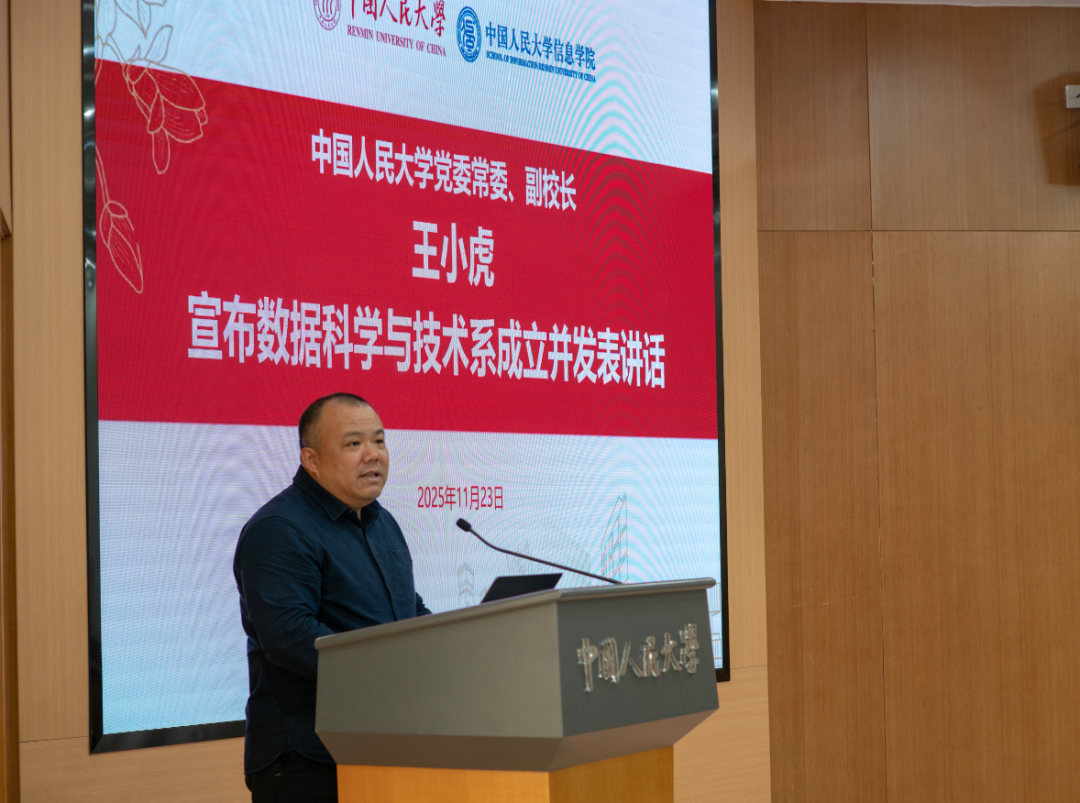 在成立仪式上,王小虎正式宣布数据科学与技术系成立,并表示热烈祝贺。他指出,党中央高度重视数字中国建设,习近平总书记多次强调要“构建数据基础制度体系”,数据已成为国家发展的关键战略资源。在此背景下,数据科学与技术系的设立,是学校服务国家战略需求、顺应时代发展趋势的重要举措,也是优化学科布局、推进新工科建设的关键一步。王小虎回顾了中国人民大学在数据科学与技术领域四十余年的深厚积淀,指出学校已形成较为完善的学科体系,取得多项具有影响力的标志性成果,为数据科学与技术系的设立奠定了坚实基础。他强调,希望数据科学与技术系以“数据+智能”为核心方向,面向复杂社会治理需求推进科研创新、打造数智融合的学科特色,并进一步完善本研贯通培养体系,培养既掌握先进数据技术、又深谙治国理政之道的复合型高层次人才,为国家数字化发展贡献更大的力量。