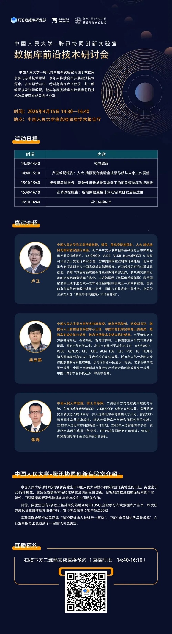 在小说阅读器中沉浸阅读 中国人民大学-腾讯协同创新实验室专注于数据库事务与存储技术领域,多年来持续合作开展前沿技术探索。本期活动将由卢卫教授、柴云鹏教授以及张峰教授,就本年度实验室在数据库前沿技术的最新研究成果进行分享。