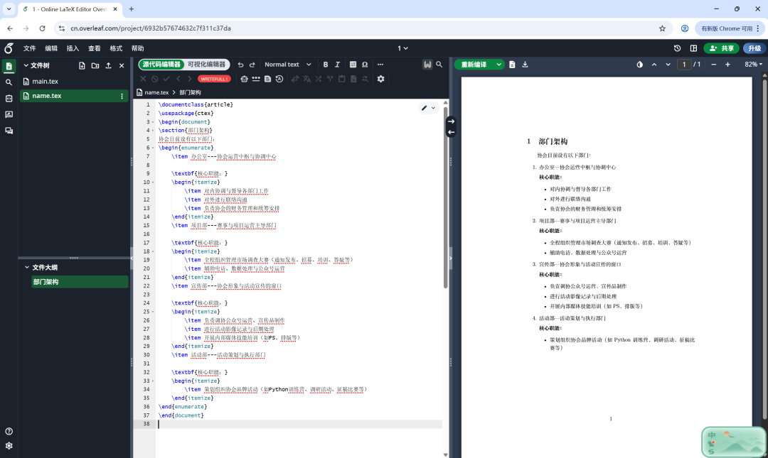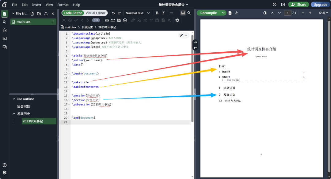 尝试输入一句简单代码,我们便完成了对于Overleaf的初步了解。