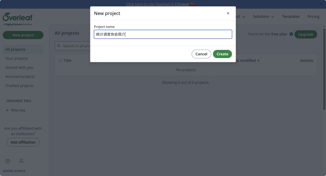 1.打开overleaf,新建blank project,命名“统计调查协会简介”