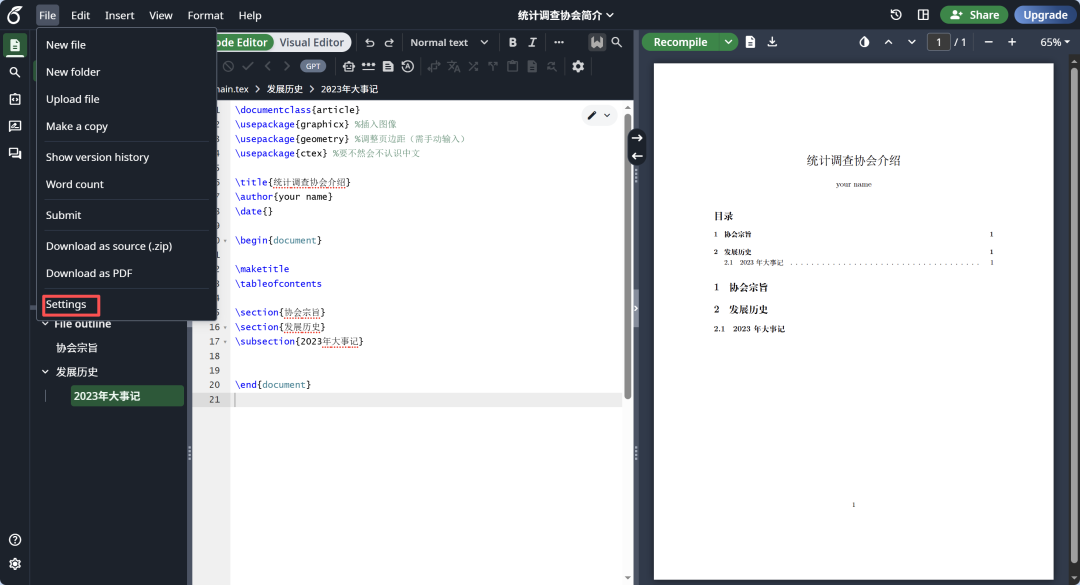 记得在文件→设置中选择 XeLaTeX(推荐)或 LuaLaTeX