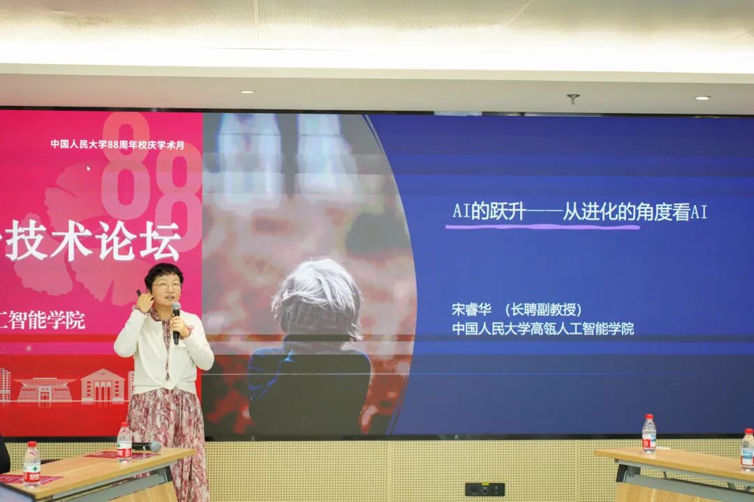 在第三个引导发言环节中,宋睿华副教授作了题为“AI的跃升——用进化的方式看AI”的报告。她指出,正如视觉系统的出现推动了寒武纪生命大爆发,当前AI技术的每次突破都如同进化中的“关键突变”,推动着系统能力的跃升。她进一步强调,AI系统可被视为具有生命周期和进化动力的“新型生命形态”,其发展轨迹可能超越人类的既有想象,呼吁学界以更宏观的进化视角重新审视AI的发展路径,思考“AI是否必须模仿人类”这一根本问题,并指出未来通用人工智能的形态或将远超当前预期。