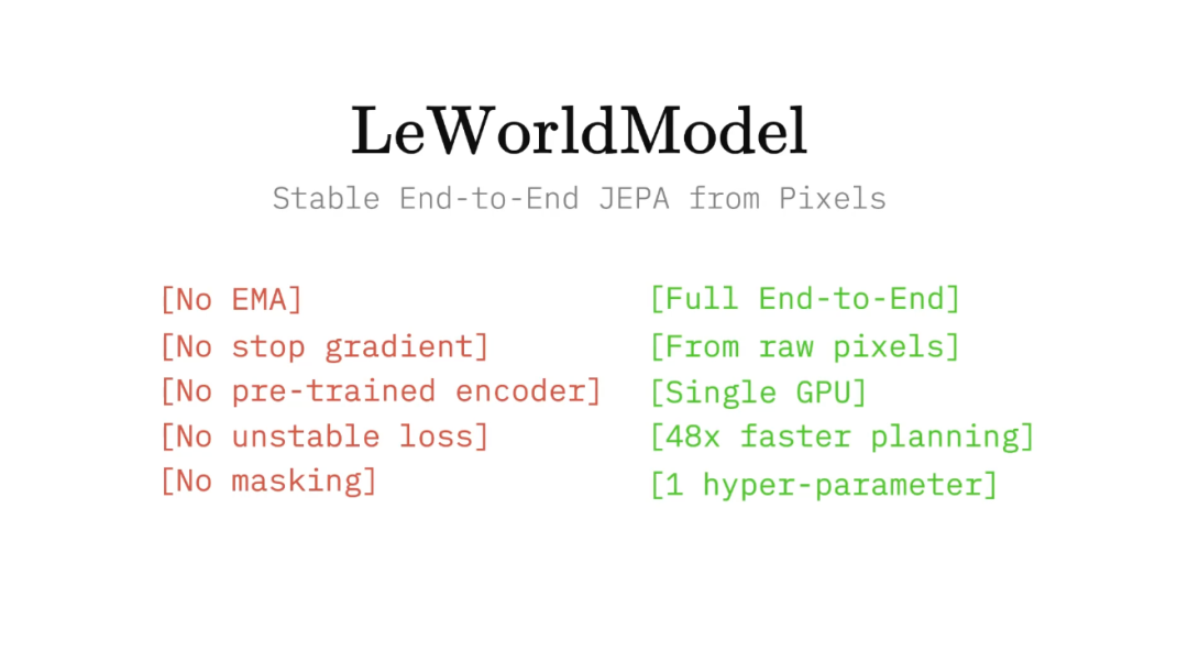 Yann LeCun 推出的LeWorldModel(LeWM),可以理解为一种更“像人类思考”的AI路径:不再直接学动作,而是先学会“理解世界”。它基于JEPA架构,从原始像素中学习环境的变化规律,再去预测“如果这样做,会发生什么”。有意思的是,它把模型结构压缩到极简——只有编码器和预测器两个核心模块,并且只用两个损失函数就能稳定训练,不需要复杂技巧。这使得整个系统非常轻量:1500万参数、单GPU几小时即可完成训练。在机器人任务中,它不仅效果超过传统端到端方法,还能在1秒内完成决策规划,速度提升高达48倍。换句话说,它用更简单的方式,实现了更快、更强的决策能力。