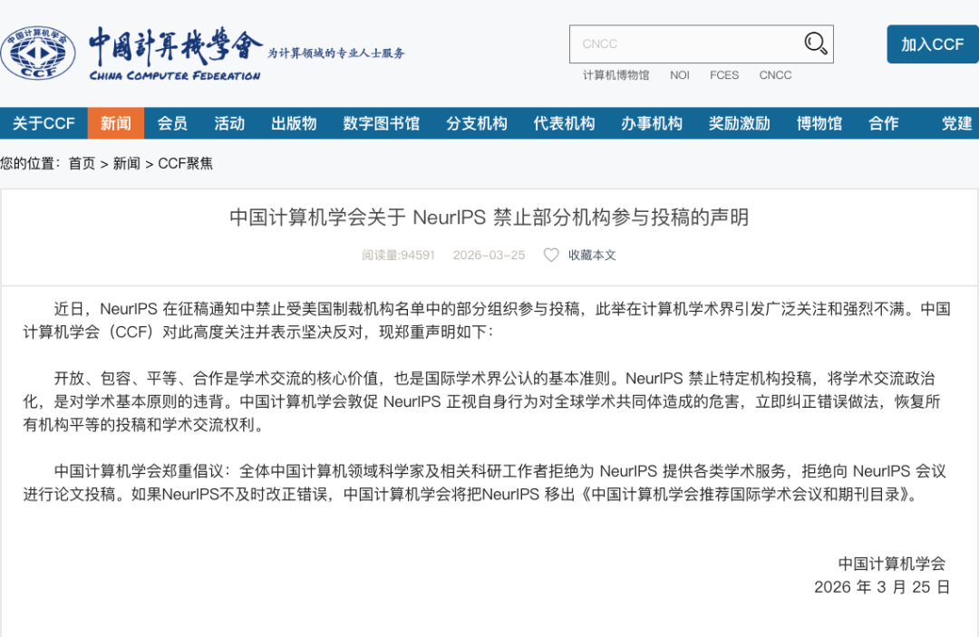 顶会 NeurIPS 近期因限制部分中国受制裁机构投稿,引发学界震动。中国计算机学会 第一时间发布声明,直指这一做法“将学术问题政治化”,违背科研应有的开放与平等原则,并敦促立即纠正。同时,CCF提出明确反制倡议,包括拒绝投稿、拒绝审稿以及停止学术服务支持,甚至表示若问题持续,可能将NeurIPS移出其推荐会议目录。对此,NeurIPS方面回应称,该限制源于必须遵守美国美国财政部外国资产控制办公室相关制裁规定。但这一解释并未平息争议,反而引发全球学界对“法律合规”与“学术自由”边界的广泛讨论。换句话说,这不仅是一次投稿规则调整,更是一次对学术共同体基本原则的冲击。