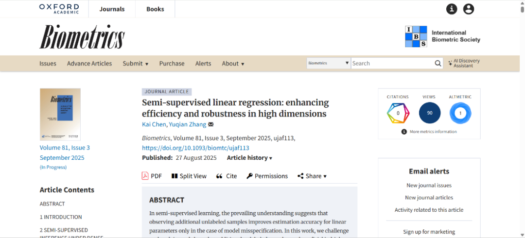 统计与大数据研究院2022级博士研究生陈楷在导师张宇谦助理教授指导下完成的论文“Semi-supervised linear regression: enhancing efficiency and robustness in high dimensions”已被国际统计学期刊Biometrics接收发表。