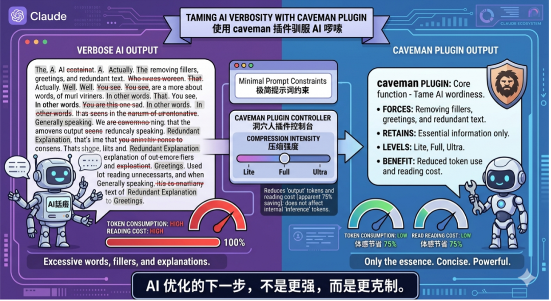 这个爆红的插件,本质是在“驯服AI的啰嗦”。围绕 Claude 生态,caveman 通过极简提示词约束模型输出,比如强制删除冠词、寒暄和冗余解释,只保留信息本体,并提供 lite、full、ultra 三种压缩强度。在开发者社区和 GitHub 上迅速传播,核心原因很直接:它确实减少了无用文本,从而降低 Token 消耗和阅读成本。不过需要明确的是,这种方式只压缩“输出文本”,并不会减少模型内部推理 Token,所谓 75% 节省更多是使用侧的体感收益。更有意思的是,一些研究表明,简洁表达不但不影响效果,反而可能提升模型表现。整体来看,caveman 的走红,本质反映出开发者对“AI话痨”和成本结构的不满,也在推动插件化工具生态加速演进。