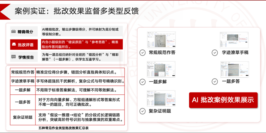 本平台打造了“精准教学-精确诊断-即时反馈”的智慧闭环,实现了从核心数学公共课到所有数学专业课的全覆盖。通过将“作业处理自动化、学情诊断智能化、服务个性化”贯穿全流程,学生提交作业后仅需三分钟即可获得详尽的AI批改,并辅以“一键申诉”的人机协作复核机制,在保障3.6%低异议率与高准确性的同时,为教师生成多维度的学情图谱。目前,该平台已在百所高校投入使用,本学期承载超300万份批改任务,凭借秒级响应与深度洞察,成功推动了教学范式从“以教为主”向“以学为主”的根本性变革,重塑师生角色,让教师回归引导本位,让学生成为知识的主动探究者。