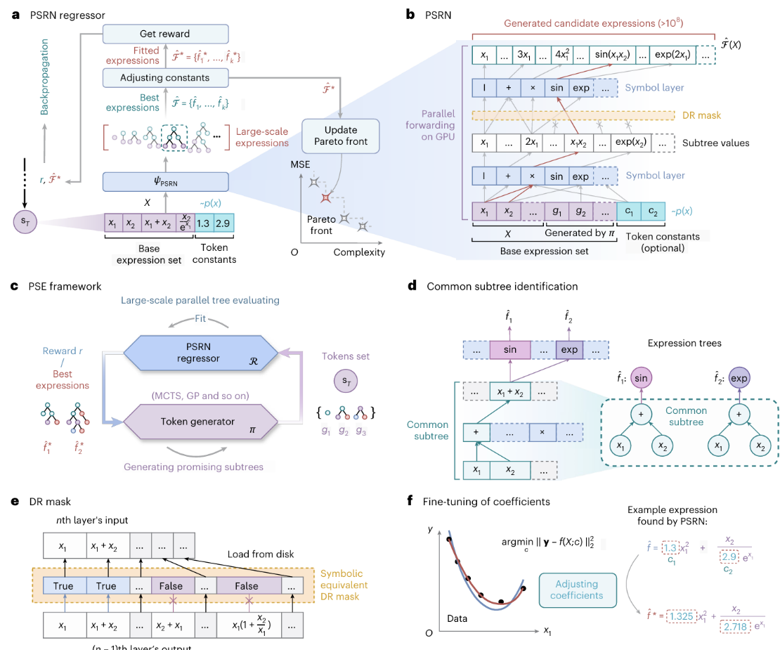 图1 | PSE模型概览。a) PSRN回归器生成候选表达式,通过误差评估得到最优表达式,再经最小二乘法微调系数后更新帕累托前沿。b) PSRN前向计算将数据张量并行处理,通过多个符号层生成海量子树值,最终输出数亿候选表达式。c) 标记生成器与PSRN回归器形成闭环,驱动表达式持续优化。d) 公共子树识别使不同表达式可复用相同子树计算结果,显著减少冗余运算。e) 去重掩码层通过屏蔽符号等价表达式,有效降低GPU显存占用。f) 对表达式系数进行微调。