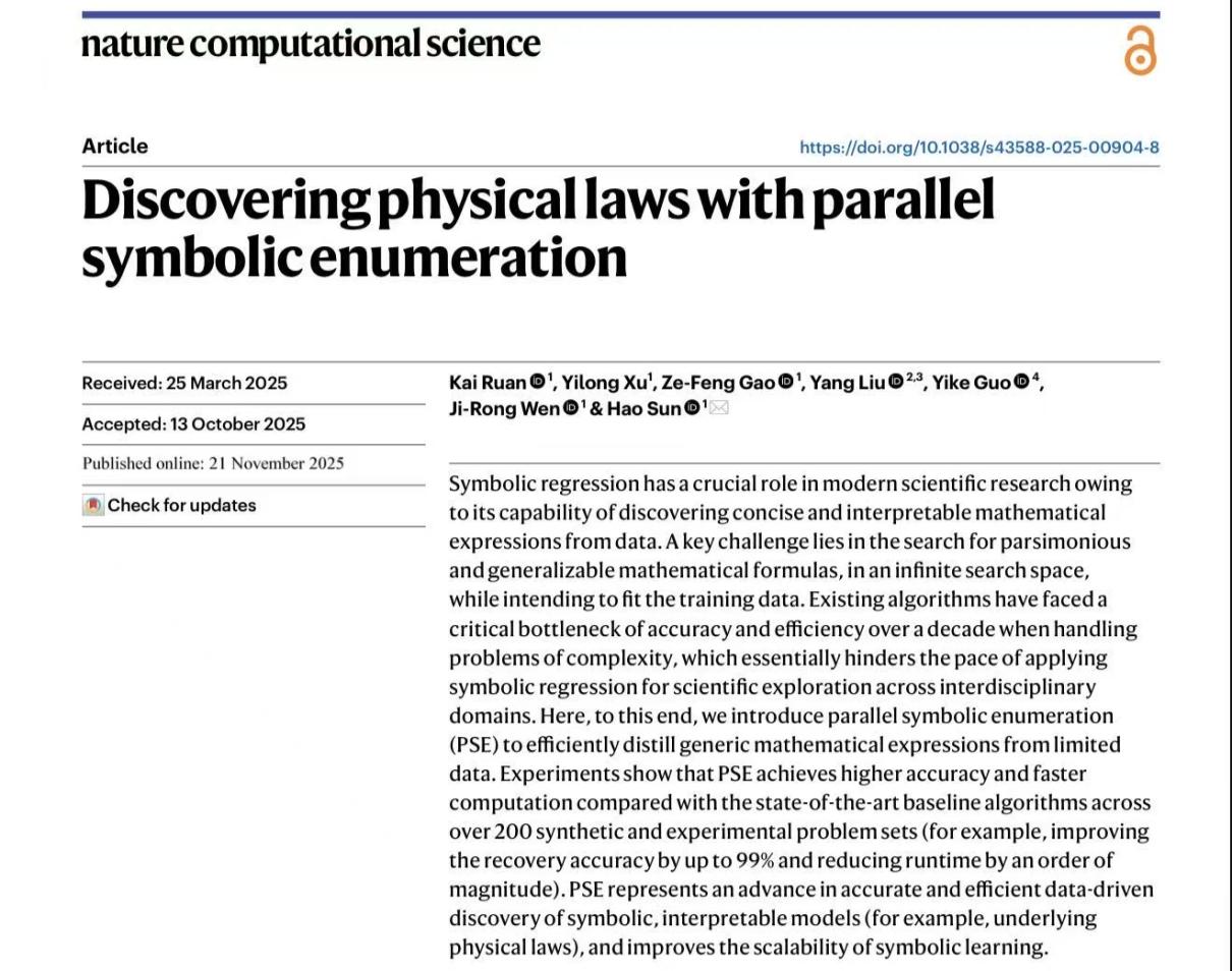中国人民大学高瓴人工智能学院长聘教授孙浩团队在Nature子刊Nature Computational Science(《自然-计算科学》)发表题为“Discovering physical laws with parallel symbolic enumeration”的Article文章,提出了一种称为并行符号枚举(Parallel Symbolic Enumeration,PSE)的符号回归方法,该方法以创新的并行符号回归网络(Parallel Symbolic Regression Network,PSRN)为核心,能够从有限的观测数据中高效、准确地发现其背后隐藏的物理规律等数学表达式。文章第一作者为阮恺(博士生),通讯作者为孙浩。