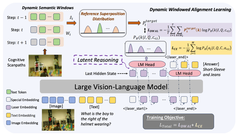 论文概述:尽管思维链赋予了VLM多步推理的能力,但其显式的文本推理过程往往受制于信息带宽的瓶颈,在离散化分词的过程中,连续的视觉细节会被轻易丢弃。近期的隐空间推理方法试图解决这一挑战,但由于固化的自回归目标,往往会陷入过早的语义坍塌。论文提出了一种全新的隐空间推理范式Laser,通过动态语义窗口对齐学习重构了VLM视觉推理过程。Laser将模型隐状态状态与逐步坍缩的动态token序列进行对齐,构建了一种由探索到确定的认知过程,使VLM在最终聚焦局部细节之前,能够维持全局特征的概率叠加态。