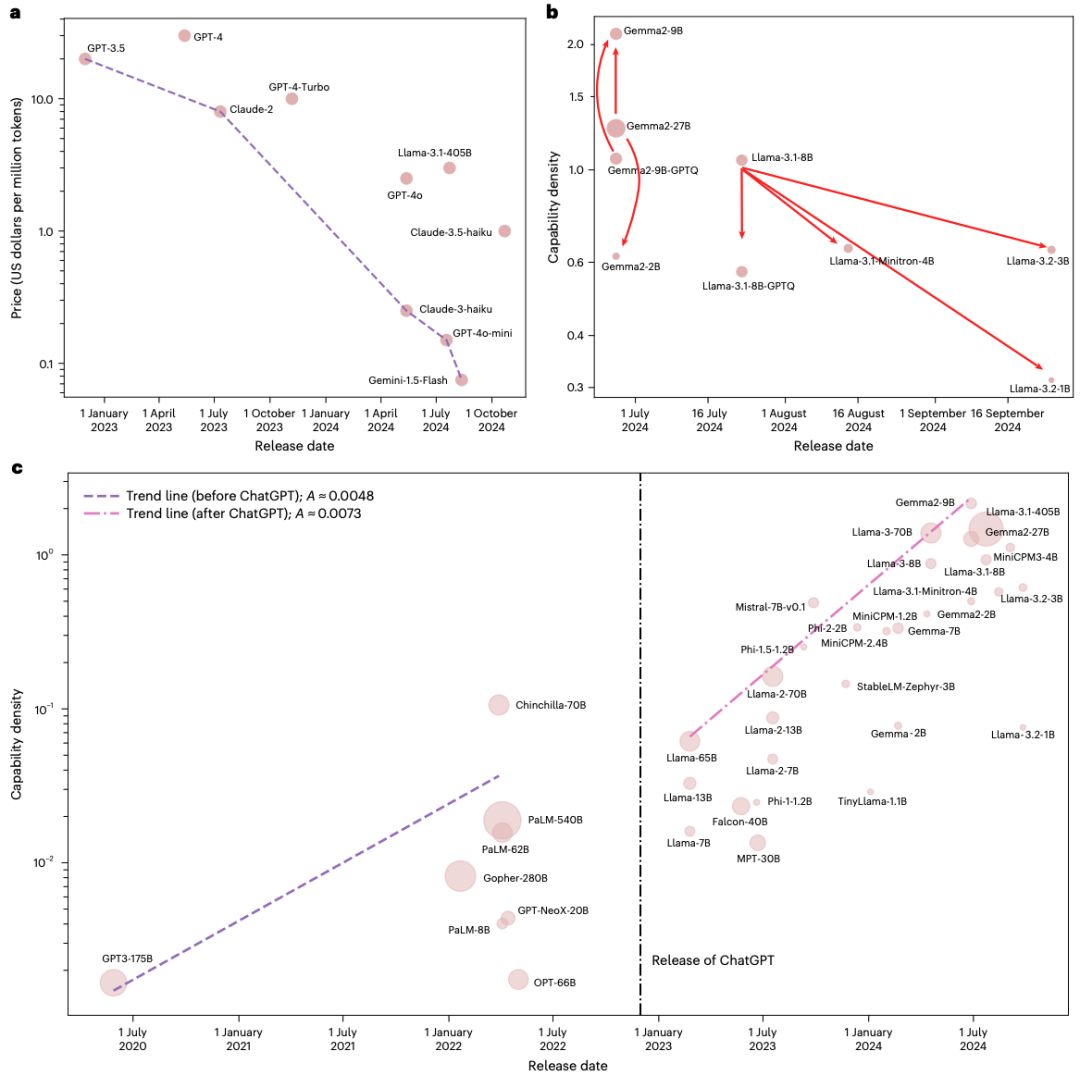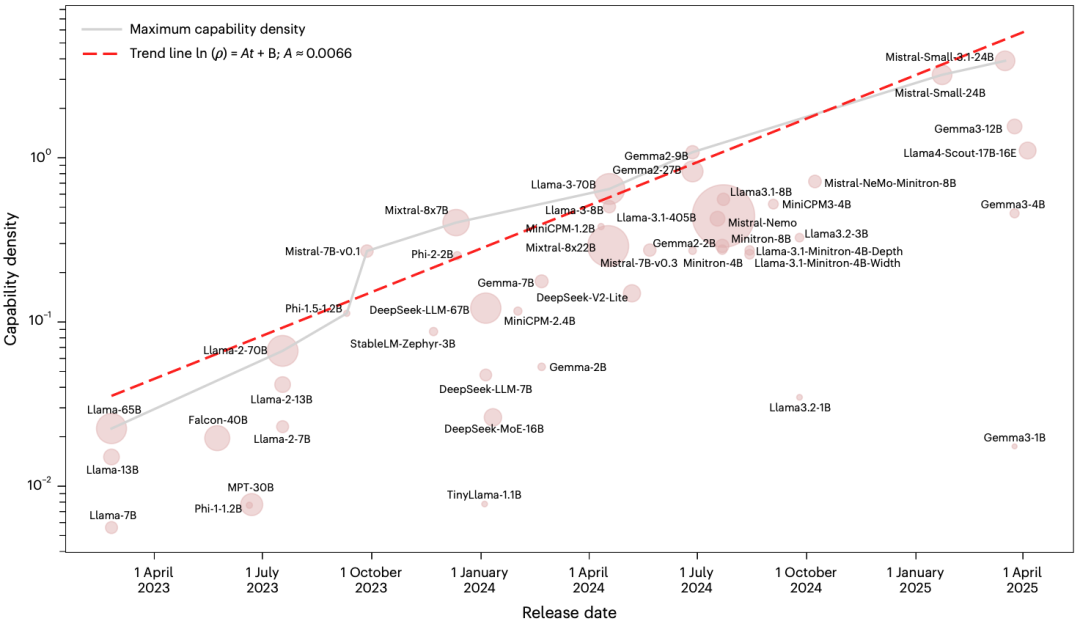 正是在这样的背景下,清华大学与 OpenBMB 团队于2025年11月在 Nature Machine Intelligence 发表重磅论文《Densing Law of LLMs》(《大语言模型的密度定律》),首次提出 “能力密度”(Capability Density) 这一核心概念,并揭示了一个令人震撼的经验规律: