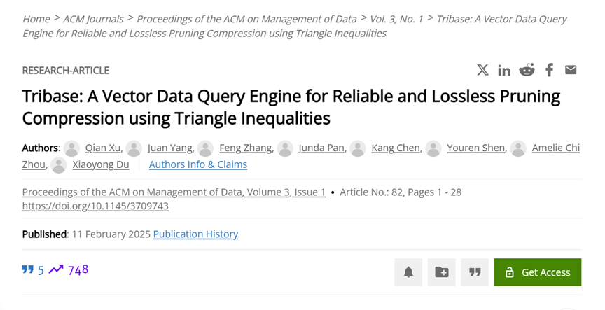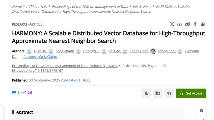 许骞也在向量数据库领域钻研,提出的Tribase系统利用三角不等式进行搜索空间收缩,在保障召回率的同时大幅减少了计算与访存开销,相关成果发表于SIGMOD 2025。更进一步,他将于SIGMOD 2026发表的Harmony工作,则着眼于分布式环境下的可扩展性问题,提出了多粒度数据划分与调度策略,旨在优化不均衡负载下的系统吞吐与查询时延。