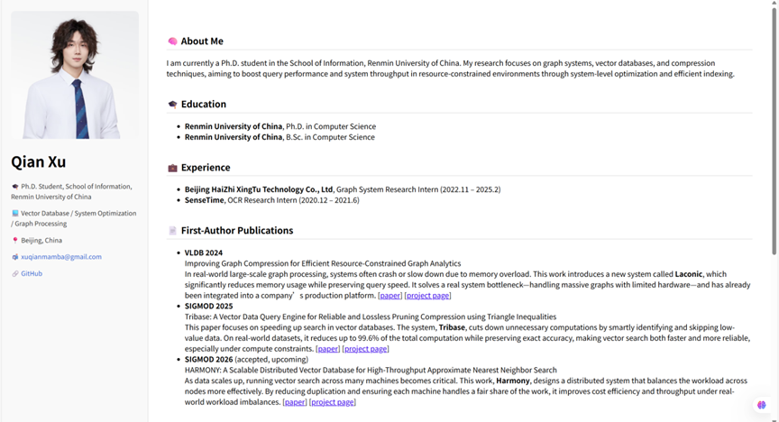 回望这一路的科研旅途,许骞始终保持着对技术本质的探究欲望。从图数据的压缩到分布式向量检索系统的实现,他每一步都走得扎实而深远。未来,他想继续深耕数据系统底层,探索更高效、更智能的系统架构,参与构建支撑通用人工智能时代的数字基石。