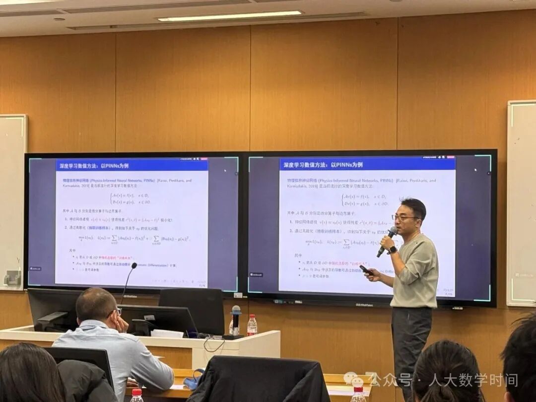 2025年12月3日16:00,在中国人民大学立德楼603教室,第三十七期“人大数学时间”活动成功举行。本期活动聚焦计算数学前沿问题,特别邀请了中国科学院数学与系统科学研究院周涛研究员,以《偏微分方程数值解:深度学习方法的机遇和挑战》为主题,开展报告及前沿问题研讨,吸引了线上线下众多数学爱好者与专业人士参与。活动由葛化彬、朱晓宝老师主持,现场学术氛围浓厚。