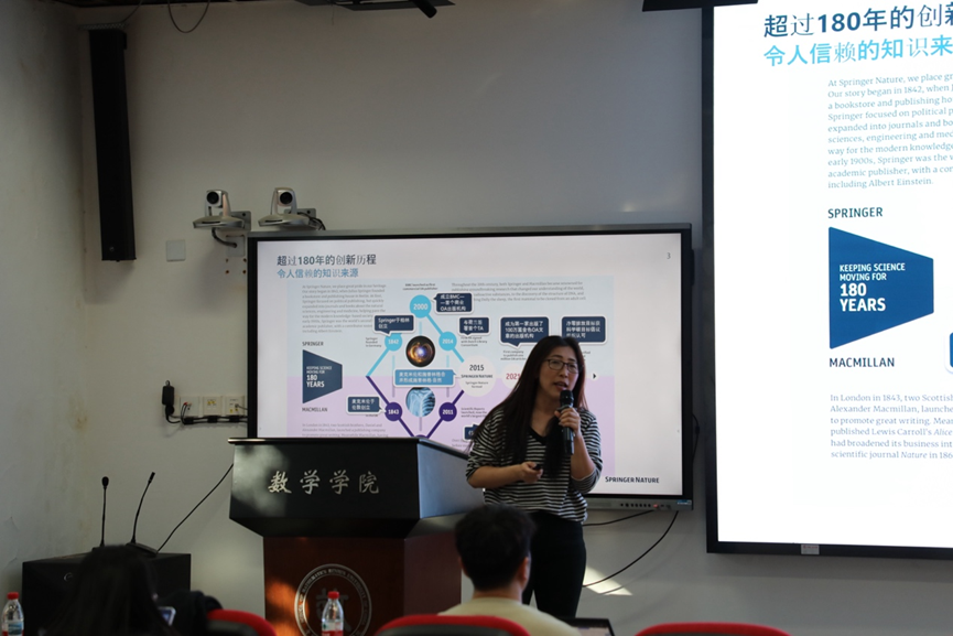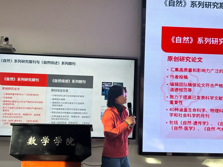 在小说阅读器中沉浸阅读 2025年11月20日下午,学“数”青年教师成长论坛第五期在数学楼二层报告厅成功举办,本次报告特邀施普林格∙自然大中华区客户发展经理靳乐以及解决方案专员卫吉丽两位老师作为主讲嘉宾。本次报告以“如何使用Springer Nature数据库助力您的学习与科研”和“走进《自然》系列期刊:理解、探讨和分享科学”为主题,吸引了新入职的教师以及即将步入科研工作岗位的学生参加。报告会由数学学院副院长姜昊教授主持。