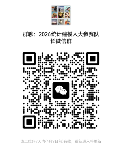 各参赛队队长加入“2026统计建模人大参赛队长微信群”(扫描下方二维码),进群需实名,实名格式:学院+学号+姓名+本/硕/博。后续有关通知将在群里发布。