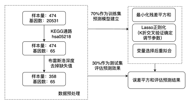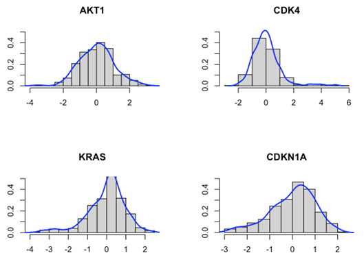 在用连续型数据布雷斯洛深度作为结局变量时,首先先对数据进行预处理。由于原始基因表达数据维数过高且存在大多数基因与结局变量无关,因此依据京都基因与基因组百科全书在线数据库(Kyoto Encyclopedia of Genes and Genomes,KEGG)中对于皮肤黑色素瘤的通路分析(通路编号“hsa05218”),仅选取通路中涉及到的65个基因纳入模型。该基因表达数据已通过Z-score标准化为零均值同量纲,选取部分基因绘制直方图如图 1中 所示。此外,去掉结局变量缺失的样本,保留358个样本的65个基因表达进入后续分析。