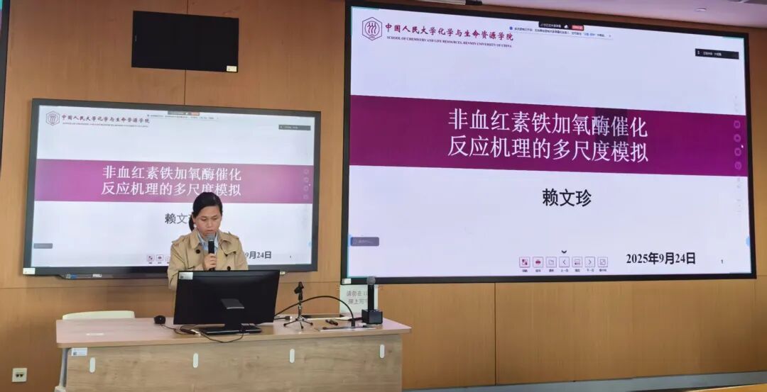 赖文珍副教授进行了题为《非血红素加氧酶催化反应机理的多尺度模拟》的报告。她以多尺度模拟研究非血红素加氧酶催化机理,聚焦其在环境修复、天然产物合成、DNA修复中的作用,揭示活性氧物种特性与反应路径,为酶工程提供理论支撑。