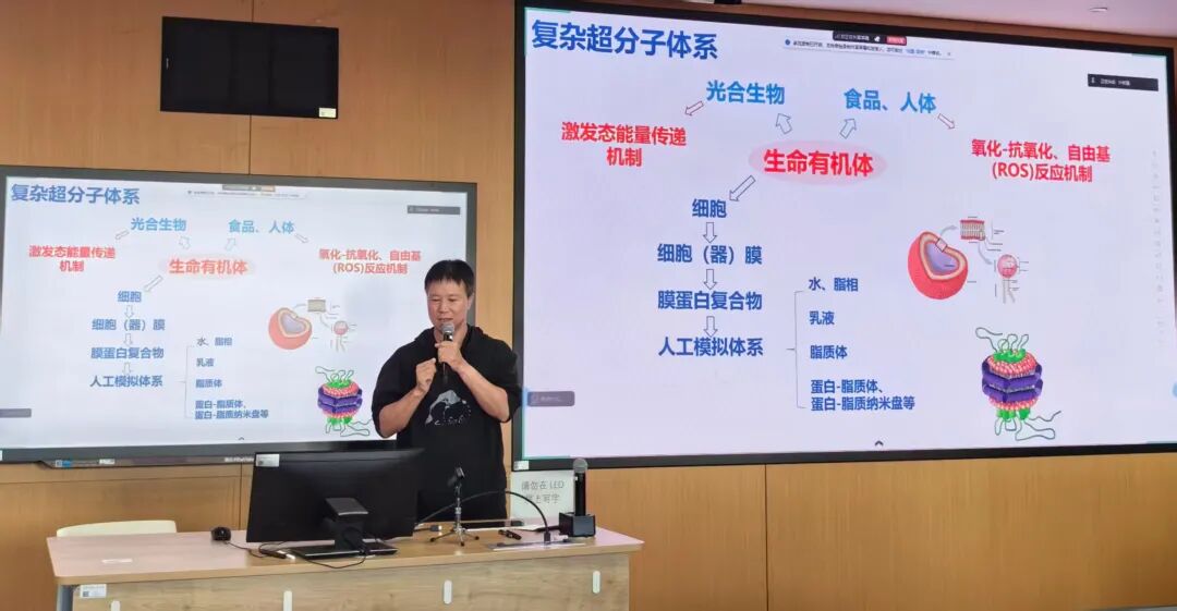 王鹏教授进行了题为《复杂超分子体系中的光谱探针》的报告。他在报告中聚焦光合生物与食品健康相关复杂超分子体系,以叶绿素、黄酮等为光谱探针,借多种光谱技术,结合脂质体等人工模拟体系,探究光能量传递、氧化抗氧化机制,明晰分子层面作用原理。