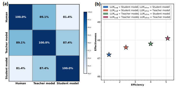 ● 基于模型的评估:评估查询意图的必要性,并检查检索到的结果是否提供了预期的答案。为提高效率,我们采用了一个由教师模型蒸馏得到的轻量级学生模型来执行评分和后续的查询优化任务。