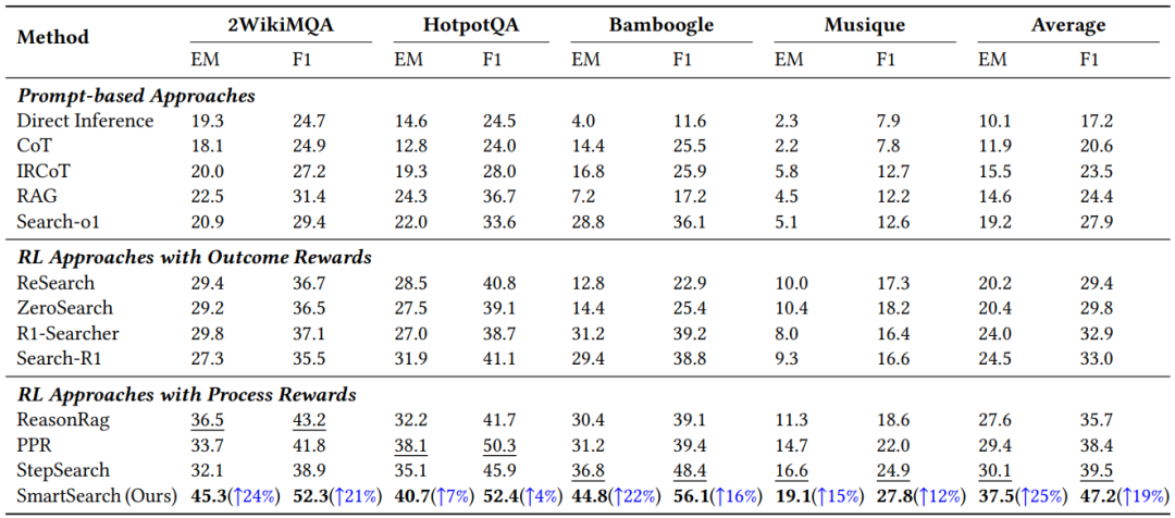 表1展示了主要结果,表明SmartSearch在四个数据集上始终优于现有方法,并得出了一些重要见解:(1)基于提示词的方法表现有限;(2)有效地纳入过程奖励能显著提升强化学习训练的效果;(3)优化中间查询的质量能显著提升整体性能。