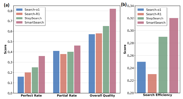 为了全面评估SmartSearch框架的有效性,我们进行了多项定量实验。图4和图5展示了其在四个关键方面的优越性:中间查询质量、搜索效率、过程奖励模型的有效性以及有效性与效率的权衡。