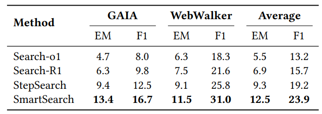 如前所述,SmartSearch仅在基于维基百科的本地搜索上进行训练。为了评估其在网络搜索中的泛化能力,我们在两个高难度的网络探索任务(GAIA和WebWalker)上,将其与多个基线模型进行了测试。如表2所示,SmartSearch在两个数据集上均优于现有方法,平均F1分数提升了近5%。