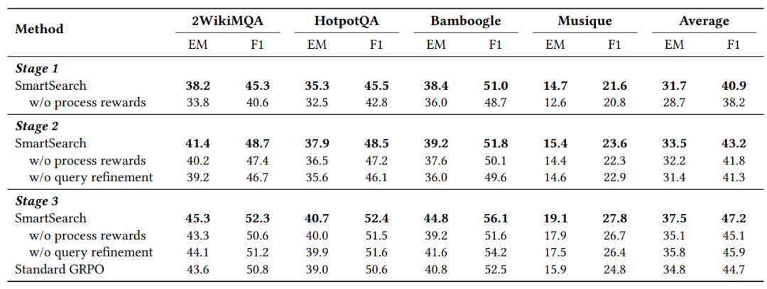 为了进一步研究SmartSearch的两个关键机制——过程奖励和查询优化的影响,我们在所有三个训练阶段进行了大量的消融研究。结果总结在表3中,体现了我们的两个关键机制和三个课程学习阶段的重要作用。