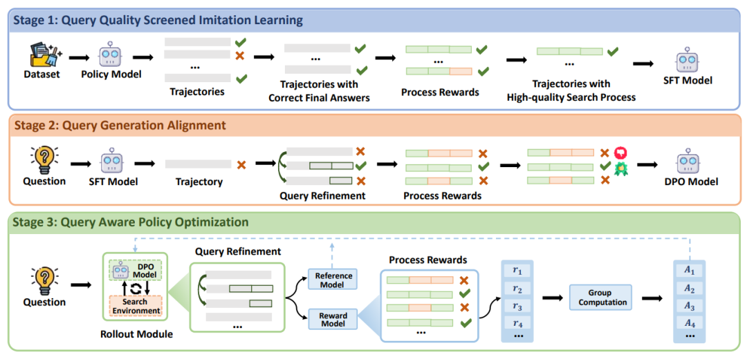 为了进一步内化提升查询质量的能力,我们提出了一个基于这些机制的三阶段课程学习框架。如图3所示,该框架包括查询质量筛选模仿学习、查询生成对齐和查询感知策略优化三个阶段。