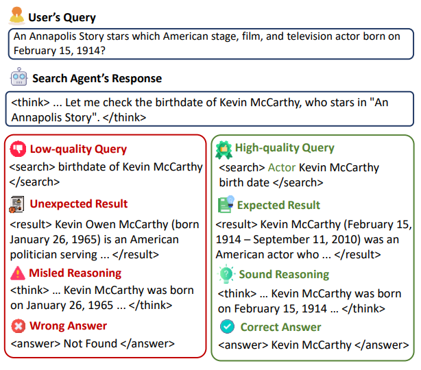 基于大语言模型(LLM)的搜索智能体通过整合信息检索能力,在解决知识密集型问题方面已展现出良好前景。当前关于搜索智能体的研究通过提示工程和微调等方法,在优化搜索智能体的推理模式方面取得了显著进展。然而,它们往往忽视了推理过程中中间查询的质量,而低质量的查询可能会导致不包含期望答案的检索结果,甚至使整个流程偏离正轨,这凸显了查询质量在深度信息查找过程中的重要性。一些研究也尝试将过程奖励融入搜索智能体的训练中。然而,这些研究往往更侧重于塑造更好的推理行为,而非提升中间查询的质量。此外,有研究表明,现有的训练范式常常优先考虑优化对信息的利用能力,却一直忽视对检索模式的优化。这无疑会阻碍搜索智能体实现深度且可靠的信息检索的能力,进而影响其整体性能。这些问题表明,我们需要专门致力于在训练过程中优化查询质量的方法。