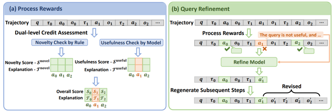 图2: SmartSearch中两个关键机制的概述:过程奖励(a)和查询优化(b)。