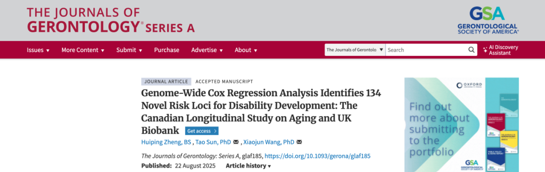 在小说阅读器中沉浸阅读 随着人口老龄化进程的加快,老年失能已成为影响生活质量和社会发展的重大公共健康问题。尽管遗传因素在失能发生中发挥着重要作用,但相关的全基因组关联研究仍十分有限。近日,我院王晓军教授团队首次开展了基于生存分析模型的全基因组关联研究(GWAS),系统探索影响老年失能发展的遗传风险。研究利用加拿大老龄化纵向研究(CLSA)老年人随访数据,发现6个全基因组显著位点和134个潜在风险位点,并在英国生物样本库(UKB)中得到部分验证。进一步的转录组关联分析、基因集与组织富集分析揭示了炎症调控、神经发生及代谢过程等关键生物学通路。团队还首次构建了失能发展的多基因风险评分(Polygenic Hazard Score, PHS), 并证实其与人口学及环境因素结合后能显著提升预测性能。同时,团队开发了可视化与个体化风险评估的在线应用平台(https://zhenghp.shinyapps.io/disability_COXGWAS/),支持GWAS结果的交互式展示及个体PHS分数的计算,为老年失能风险的预测建模和靶向预防提供了新的科学依据。本研究在老年失能遗传学领域提供了新的证据,并为建立更精准的风险预测模型与干预策略奠定了重要基础。该成果发表于老年学权威期刊Journals of Gerontology: Series A(https://doi.org/10.1093/gerona/glaf185)。