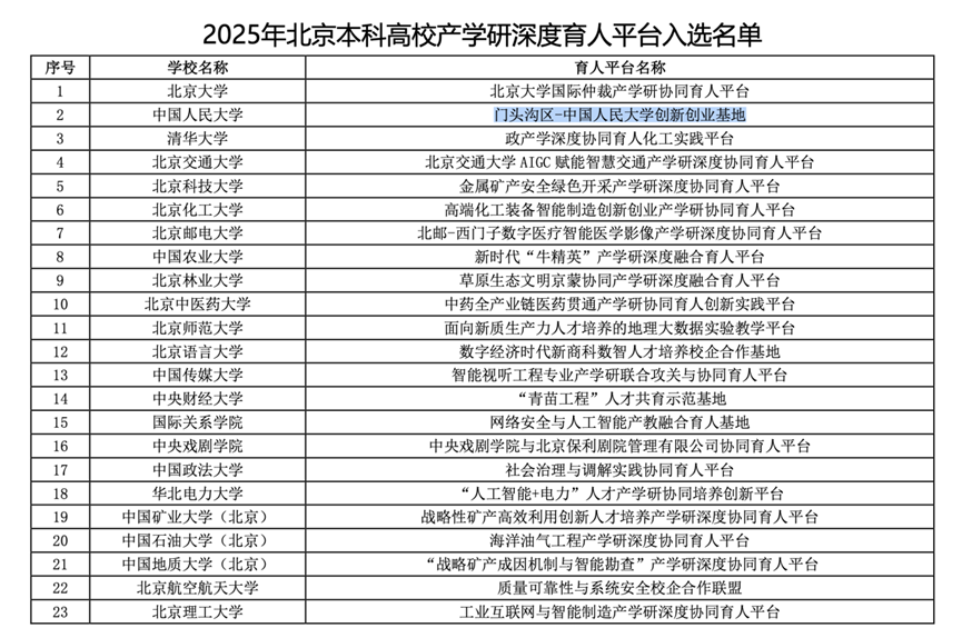 门头沟区 中国人民大学创新创业基地是中国人民大学与门头沟区深化校地协同、推动产学研融合的核心载体,也是学校重点打造的产学研深度协同育人标杆平台和“三创”重要阵地。基地紧扣区域“科技强区”战略和人工智能产业发展方向,依托京西智谷的算力资源、产业生态与政策优势,系统构建起“课程筑基—科研领航—交流拓界—实践赋能—创业孵化—投资对接”的端到端育人链条,为“三创”人才培养提供全流程支撑,推动教育链与产业链精准衔接。目前,基地已在高瓴人工智能学院取得积极成效,同时为区域治理提供智能化解决方案,为产业发展持续注入新动能。