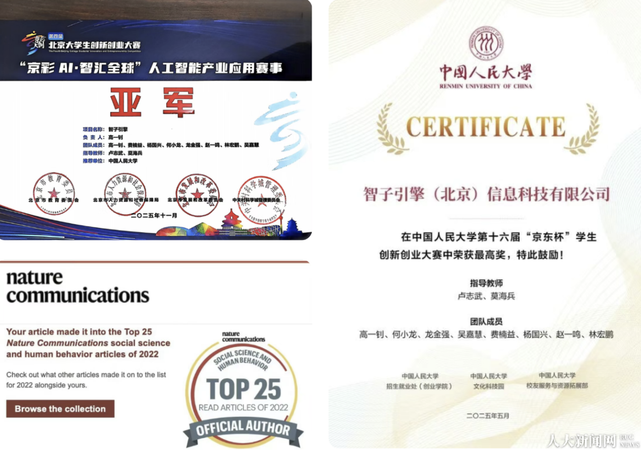 如今的“智子引擎”,已经从校园中的科研小组成长为具备产业竞争力的AI创业公司,荣获数字中国创新大赛“最具市场前景奖”、中国人民大学第十六届“京东杯”学生创新创业大赛特等奖等荣誉,并在“京彩AI·智汇全球”人工智能产业应用赛事中夺得亚军。这些成绩的背后,凝聚着学校在科研指导、资源支持与创新创业生态建设方面的持续投入,也映射出学校从学科根基到实践平台、从理念引领到资源赋能,为学生提供的全方位支撑。