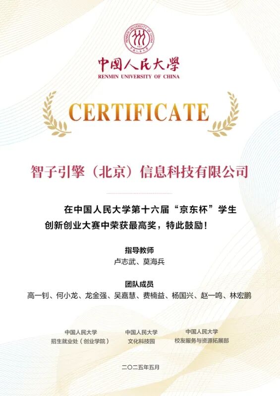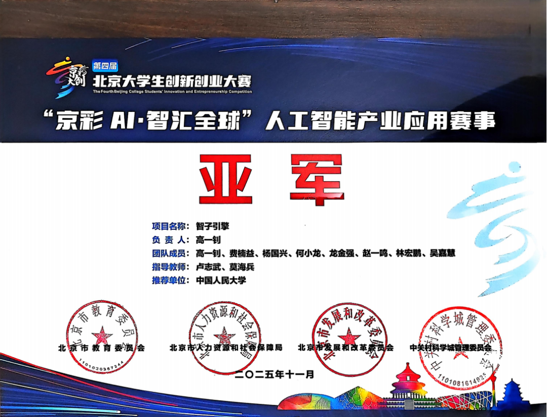如今的“智子引擎”,已经从校园中的科研小组成长为具备产业竞争力的AI创业公司,荣获数字中国创新大赛“最具市场前景奖”、中国人民大学第十六届“京东杯”学生创新创业大赛特等奖等荣誉,并在“京彩AI·智汇全球”人工智能产业应用赛事中夺得亚军。这些成绩的背后,凝聚着学校在科研指导、资源支持与创新创业生态建设方面的持续投入,也映射出学校从学科根基到实践平台、从理念引领到资源赋能,为学生提供的全方位支撑。