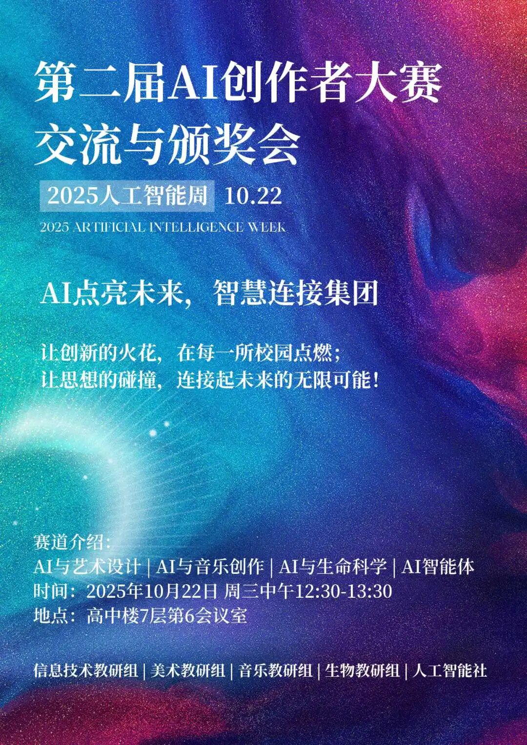 作为人工智能周的旗舰活动,第二届AI创作者大赛以“交叉赋能”为核心,设立艺术、音乐、智能体、生命科学四大赛道。我们鼓励学生将AI作为“创新伙伴”,教师将AI视为“教学协作者”,共同探索AI在特定场景下的深度应用与创意表达,产出具有前瞻性的作品,展现AI赋能个性化学习与创新人才培养的无限可能。