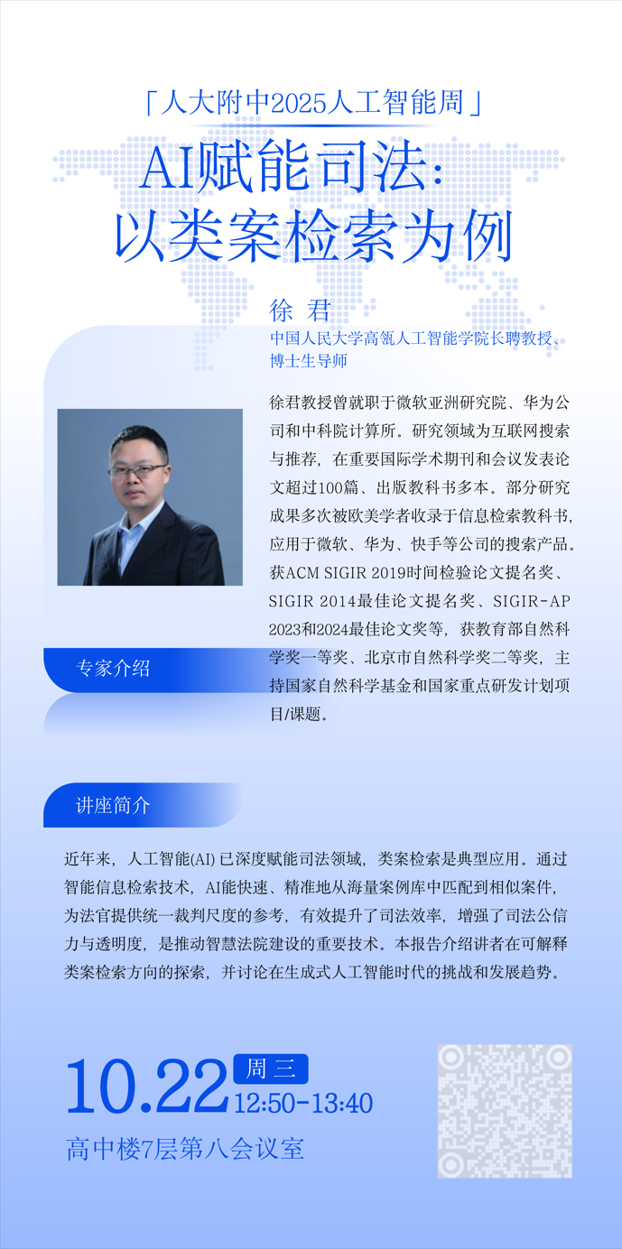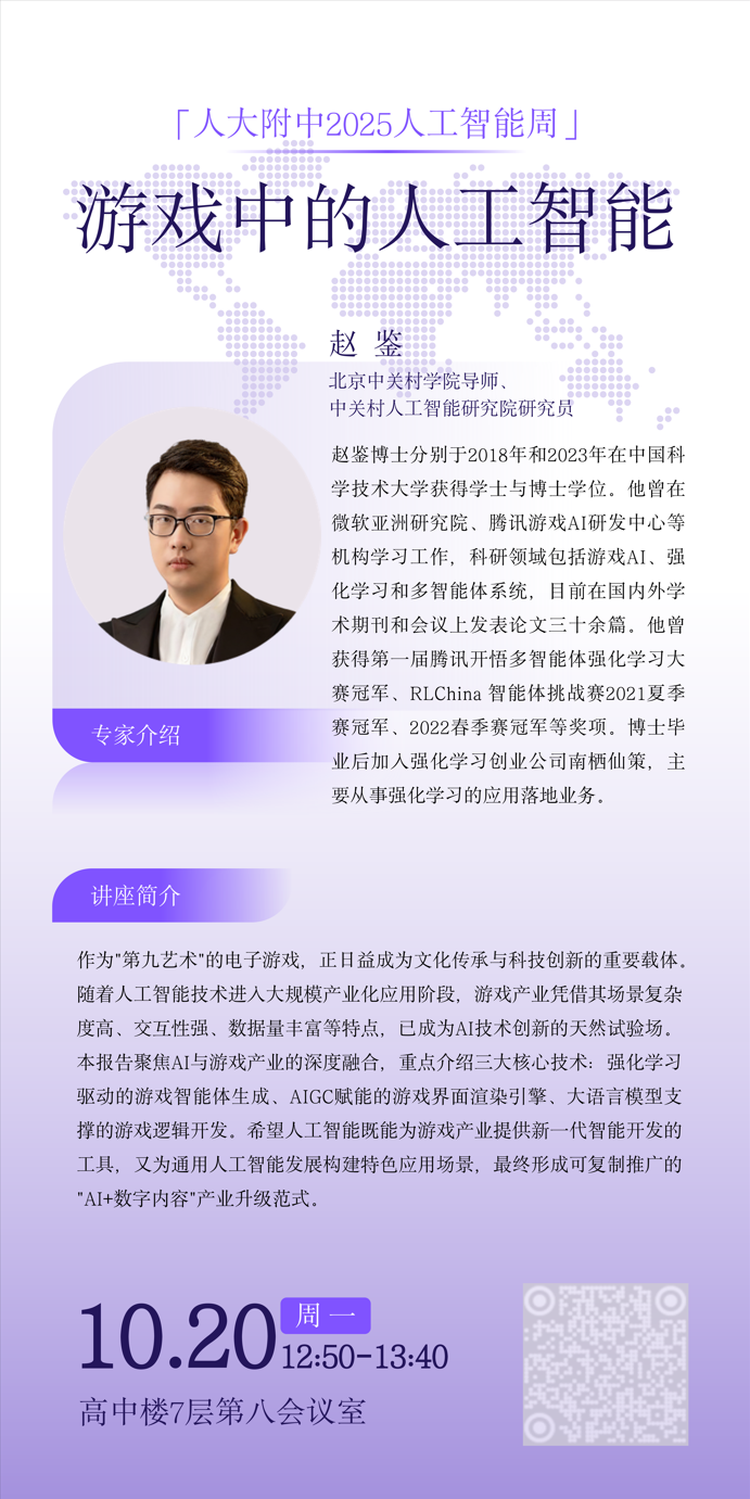 五场前沿讲座,五大探索维度。从“游戏AI”的算法奥秘到“AI4S”科研新范式,从“AI赋能司法”的实践到“具身智能”的未来,系列讲座汇聚领域专家,旨在为学生打开一扇扇通往未来的窗户,拓展认知边界,感受AI作为通用目的技术驱动各行业深刻变革的磅礴力量。